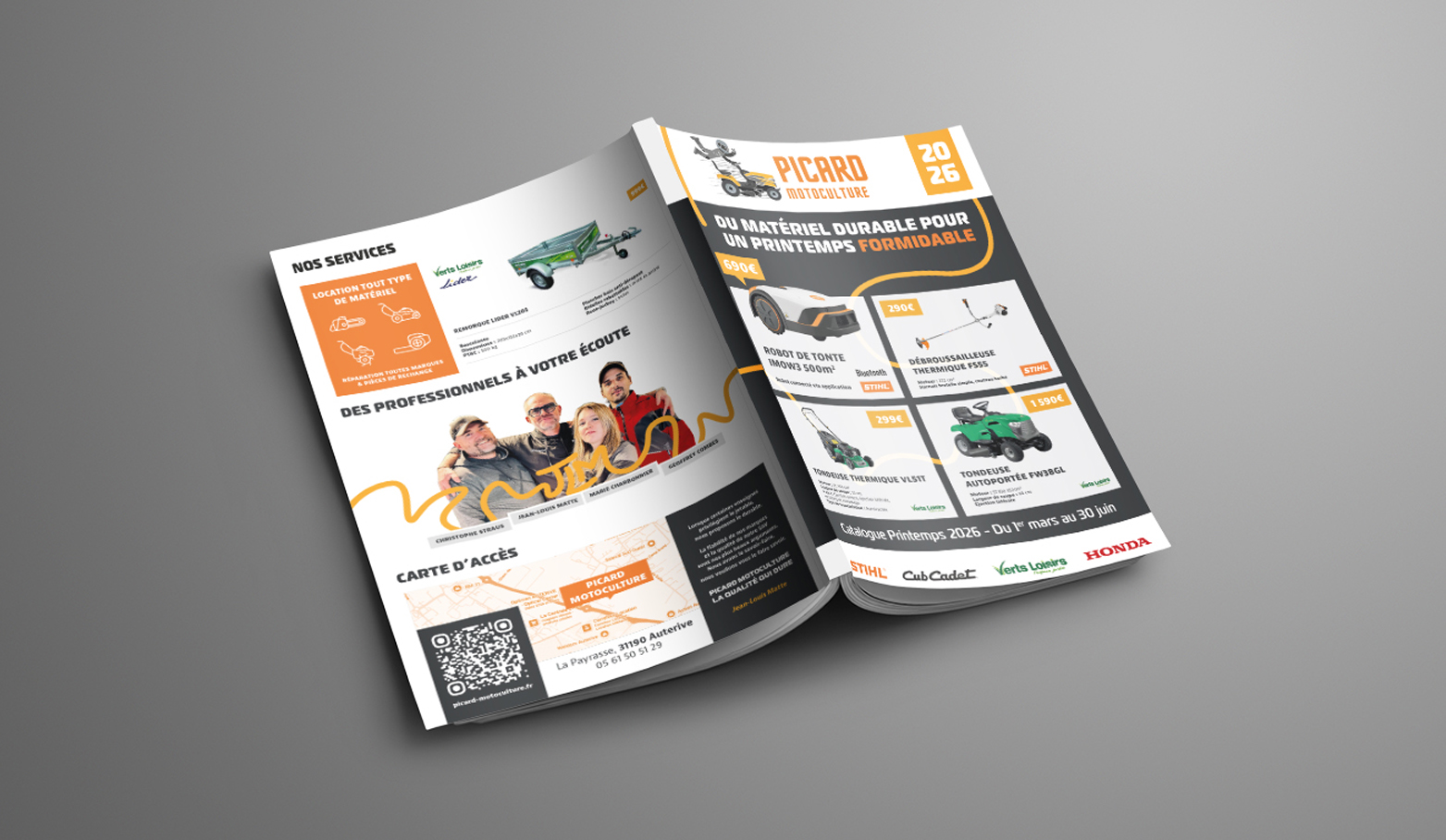 Comment rendre un catalogue produit à la fois lisible, attractif et efficace ? Avec ce projet de mise en page catalogue printemps, réalisé pour Picard Motoculture, L’Agence Sur-Mesure signe un support clair, dynamique et résolument orienté conversion.